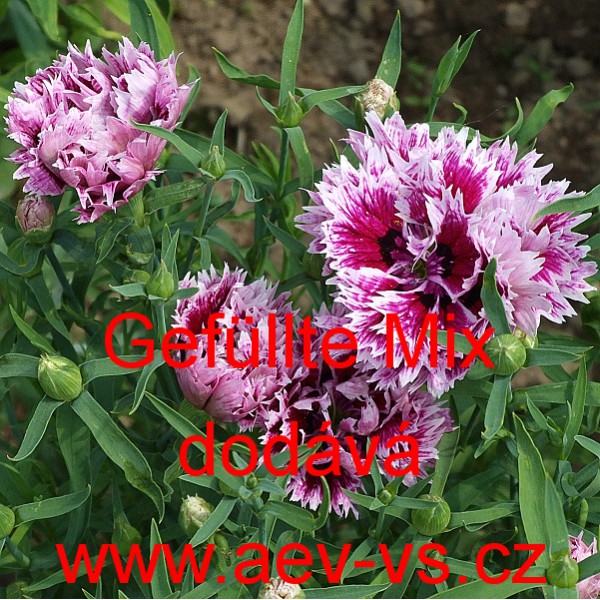 Popis: Hvozdík čínský (Dianthus chinensis) Gefüllte Mix je asi 40 centimetrů vysoká velkokvětá plnokvětá směs jednoletých květin. Hodí se na záhon, do truhlíku, květináče a okrasného koryta.